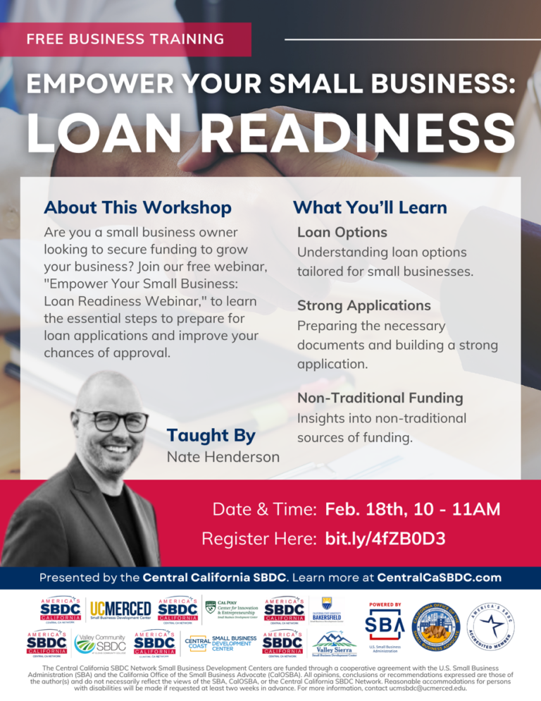 This workshop is brought to you by Central California SBDC and taught by Nate Henderson! He brings expertise from his experience with a variety of commercial banks and credit unions and as a business owner running a mortgage company and realtor. Small Business Development Centers (SBDC) provide quality business assistance to small businesses at no cost! Our business advisors provide clarity and pathways to get businesses off the ground and push current businesses to their full potential. Learn more here: https://centralcasbdc.com/